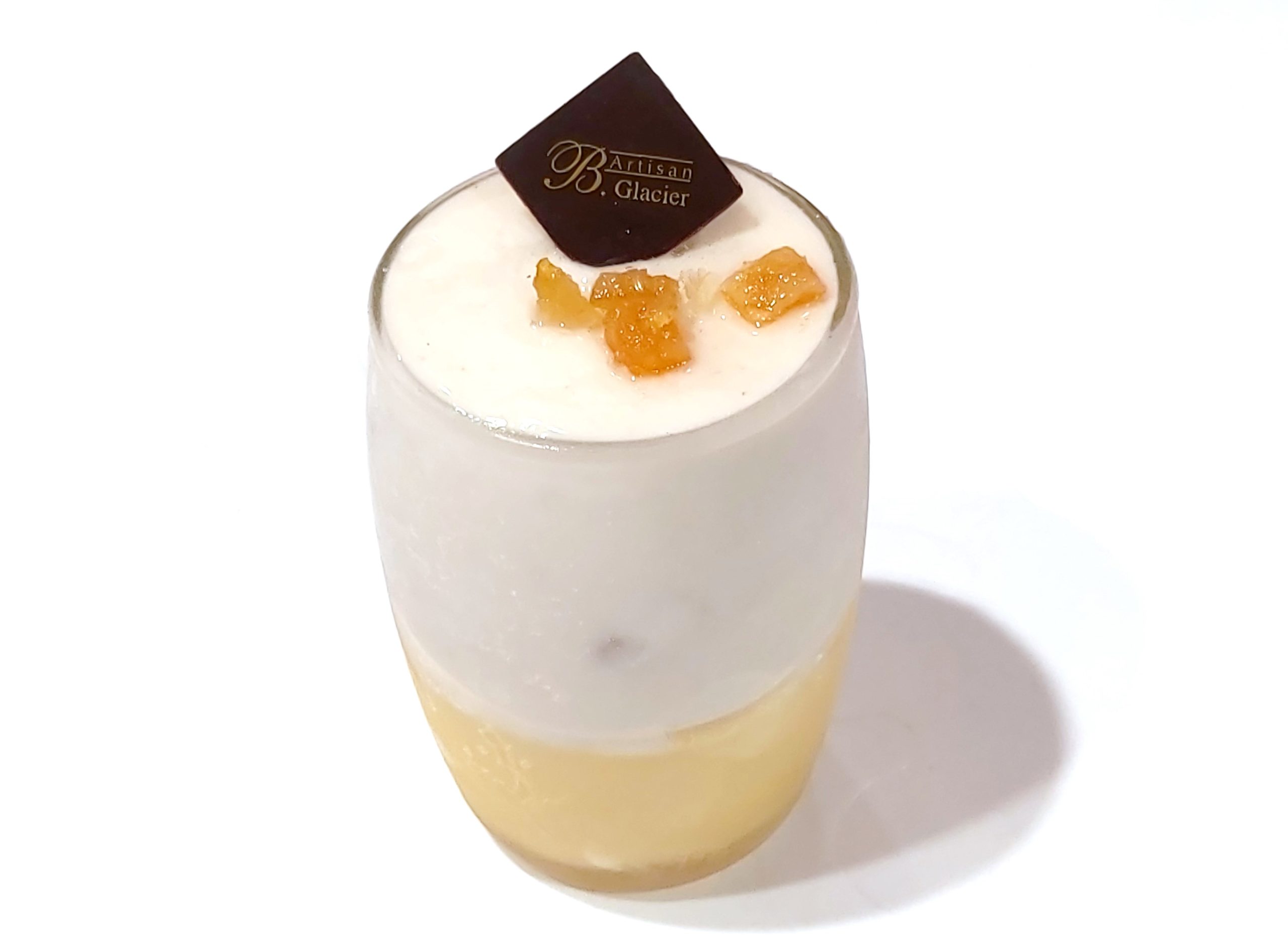 Verrine glacée : glace Châtaigne, sorbet Mandarine, brisures de marrons confits.