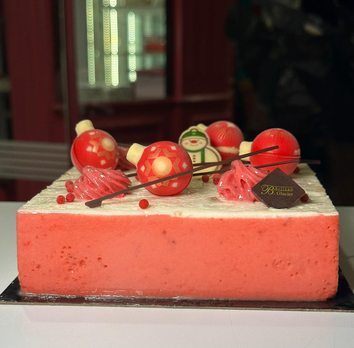 Nougat glacé (amandes effilées, miel de Sologne), sorbet Fraise, coulis de framboises.